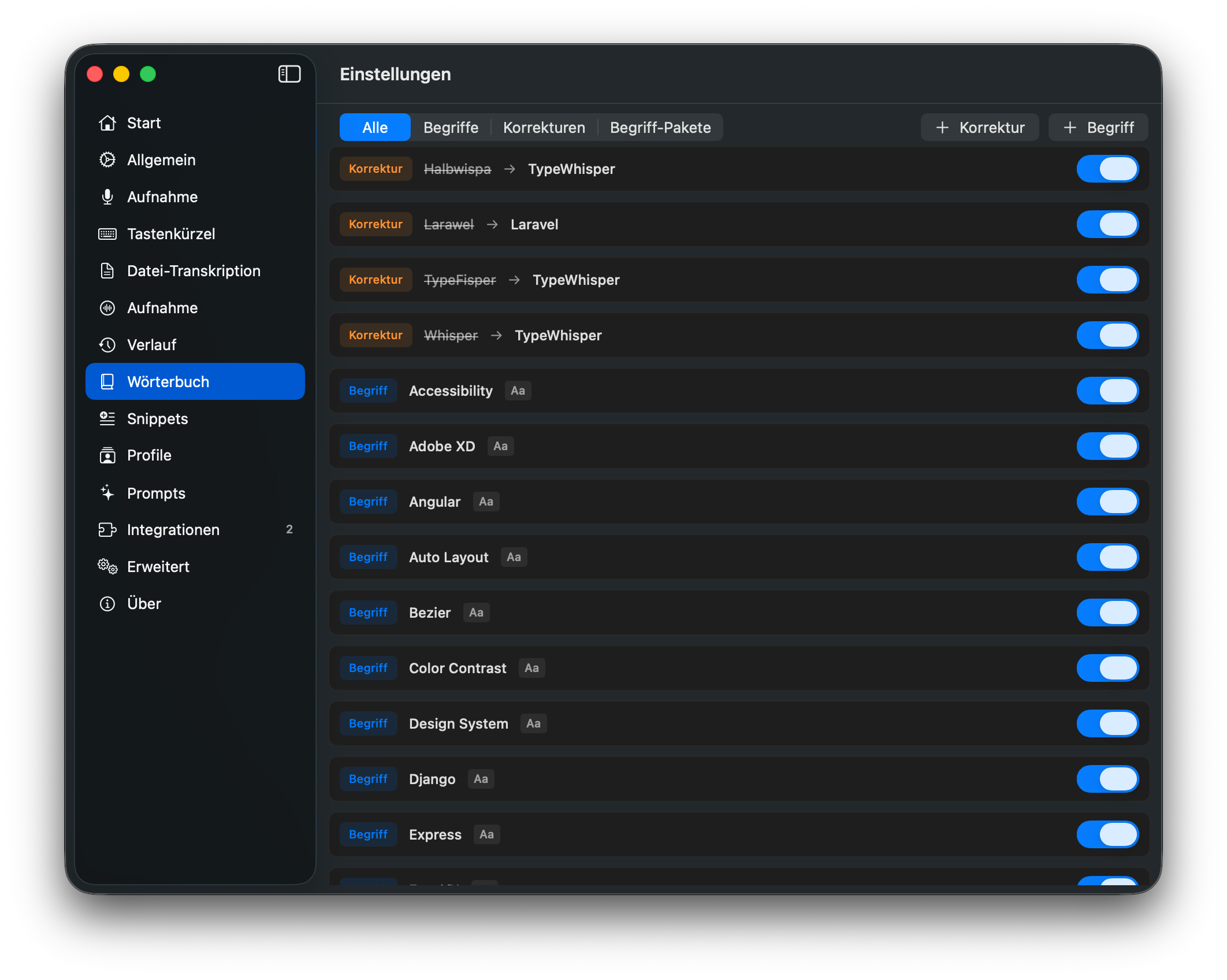 Bringe TypeWhisper fachspezifisches Vokabular bei. Füge eigene Begriffe hinzu, definiere Korrekturen für häufig falsch erkannte Wörter und aktiviere Auto-Lernen, um dein persönliches Wörterbuch aufzubauen. Importiere Community-Begriffspakete für Fachgebiete wie Medizin, Recht oder Softwareentwicklung.