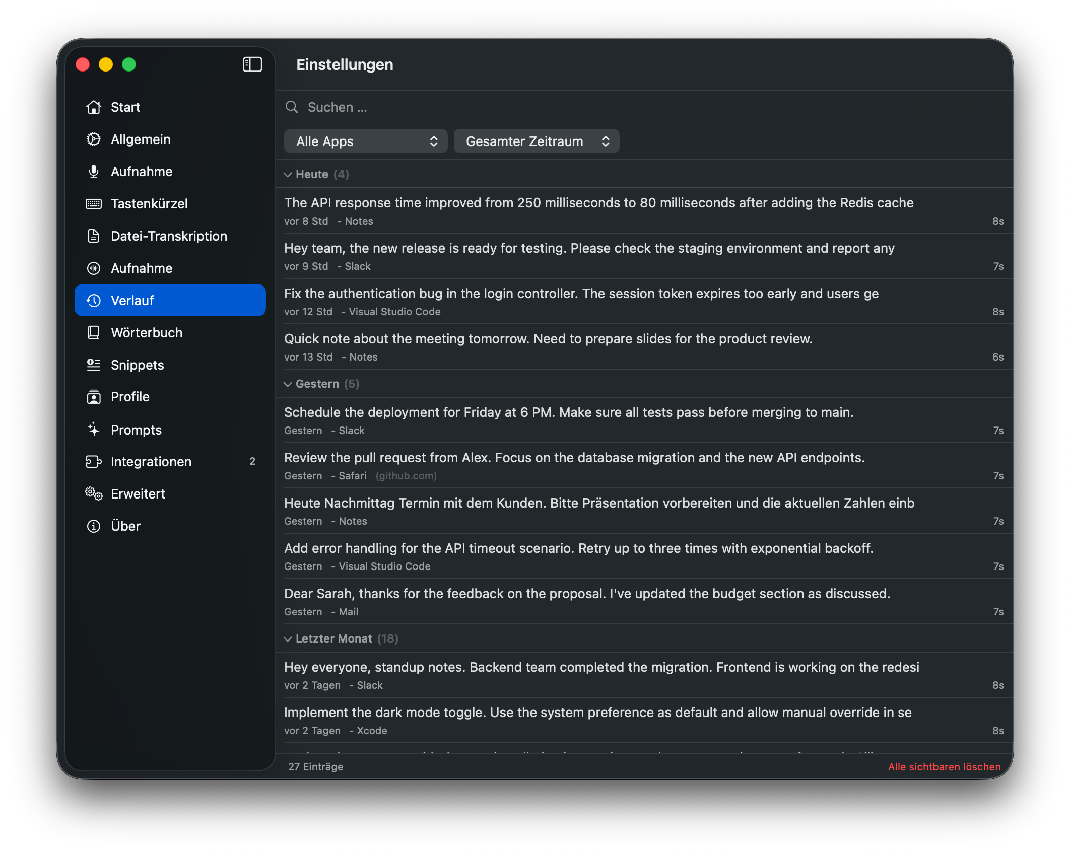 Filtere nach Datum, App oder Engine. Gruppiere Einträge nach Zeitleiste für eine klare Übersicht deiner Diktieraktivität. Wähle mehrere Einträge für Massenlösung oder Multi-Format-Export. Öffne den Verlauf als eigenständiges Fenster für eine Referenz neben deiner Arbeit.
